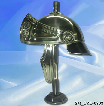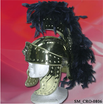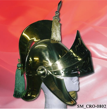 REF. SM_CRO-0808: Casco de latón pulido y lacado al horno. Celada de dos piezas fija con tubo para plumas.