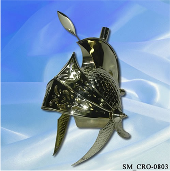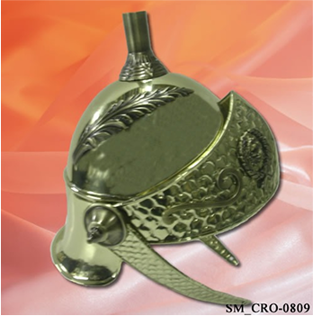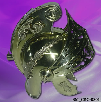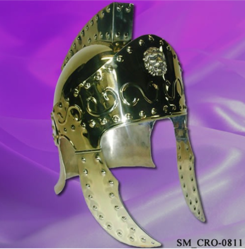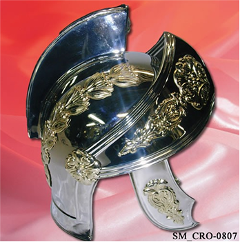 REF. SM_CRO-0802: Casco de latón pulido brillo y lacado al horno, celada, cuatro chapas soldadas y caladas y con cogotera redondeada.