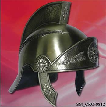 REF. SM_CRO-0812: Casco de latón envejecido satinado y lacado al horno. Con adornos satinados, porta-plumero, patillas y celadas picadas. Cogotera recta.