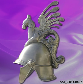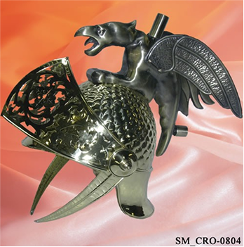 REF. SM_CRO-0805: Casco de latón envejecido satinado y lacado al horno. Dragón de chapa trabajada y cogotera redondeada.
